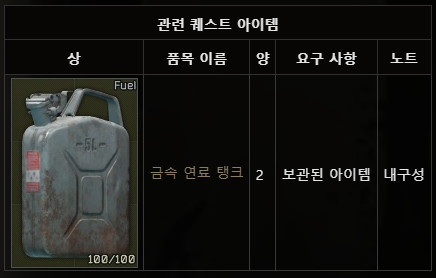 이 퀘스트에서는 쇼어라인 의 밀수 기지에 있는 창고에 금속 연료 탱크 2개를 숨겨야 합니다 .